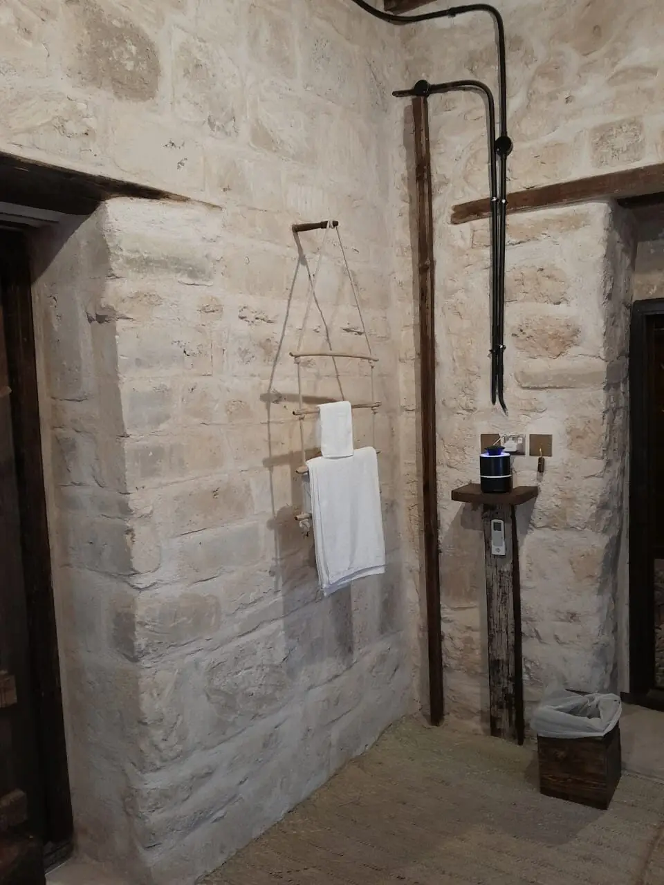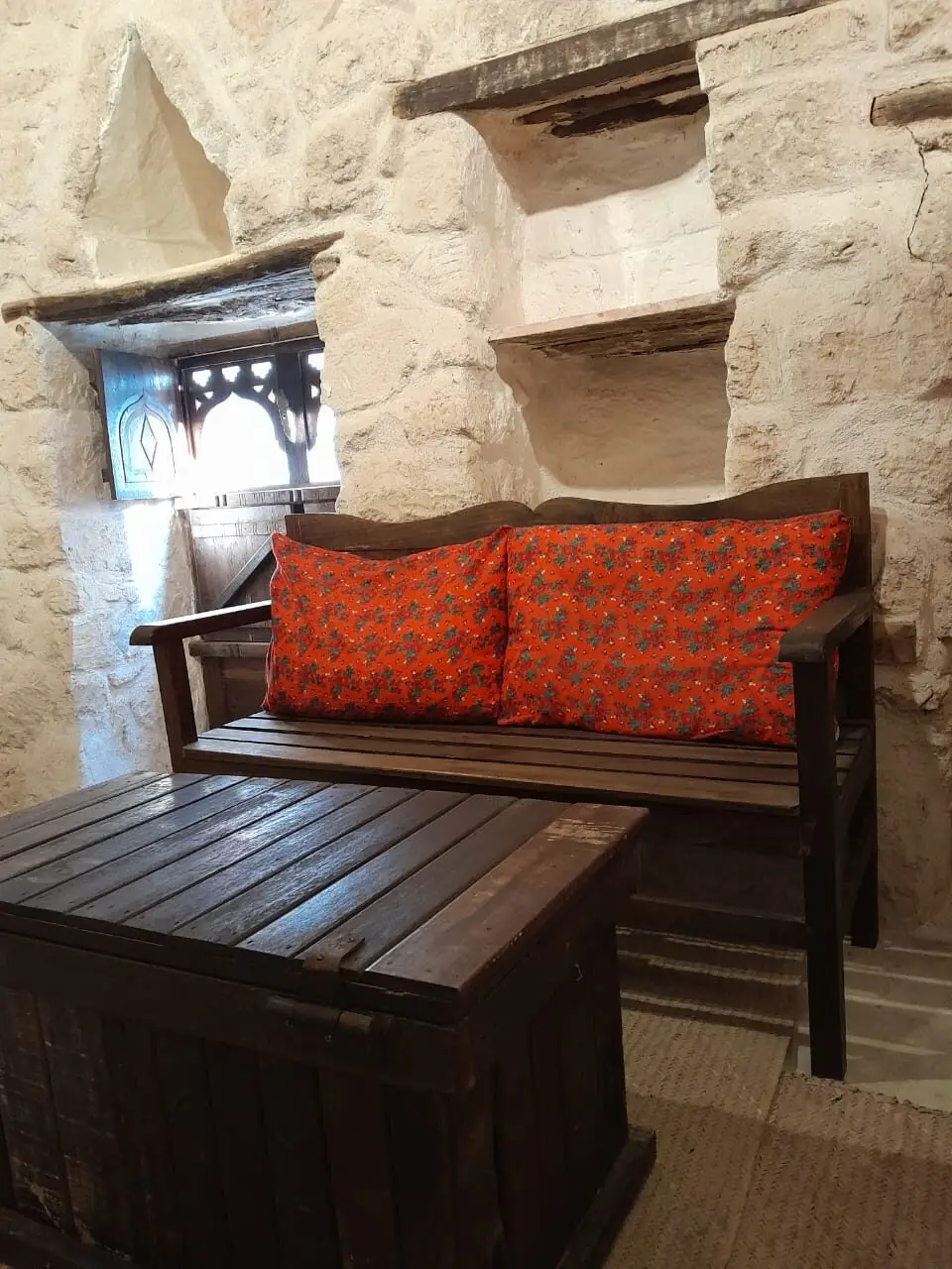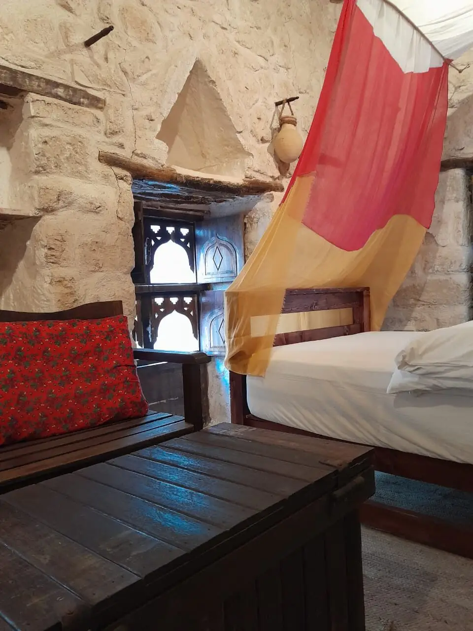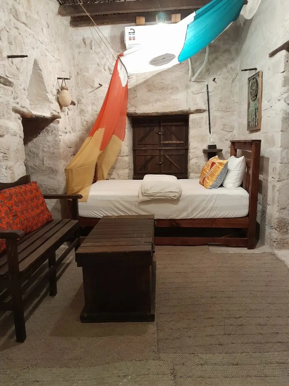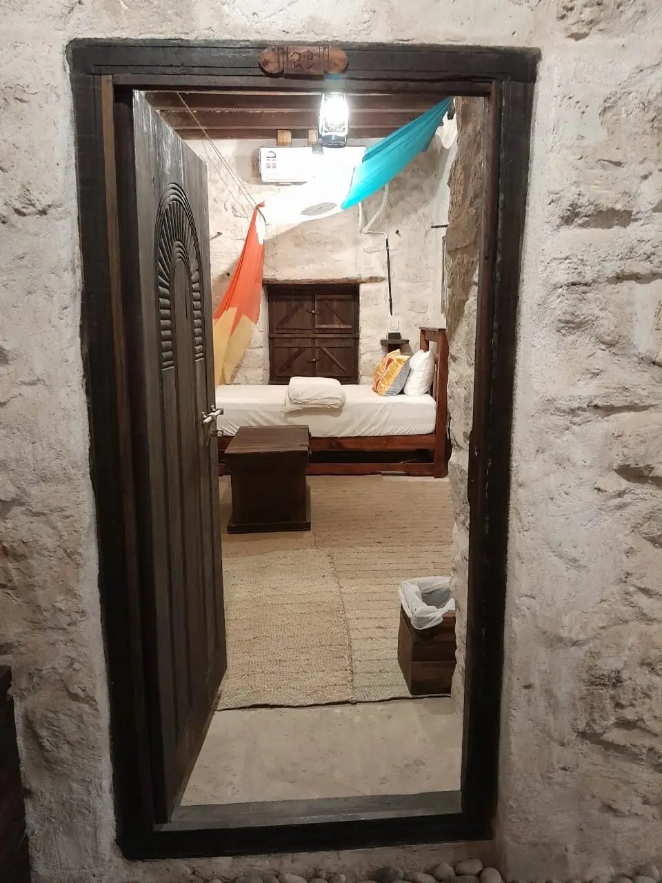 The Athum Chamber (15 m²) is inspired by the peaceful Athum Spring near the lodge. This single heritage hotel room offers a simple retreat with a single bed, wooden seating, and a shared bathroom on the same floor. The optional connecting door to the Sumhuram Chamber makes it an excellent choice for families or friends traveling together. Ideal for solo travelers, business guests, and culture enthusiasts looking for comfort with cultural connection.