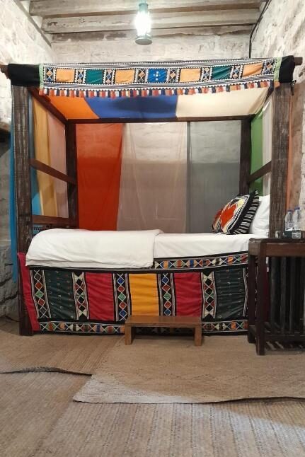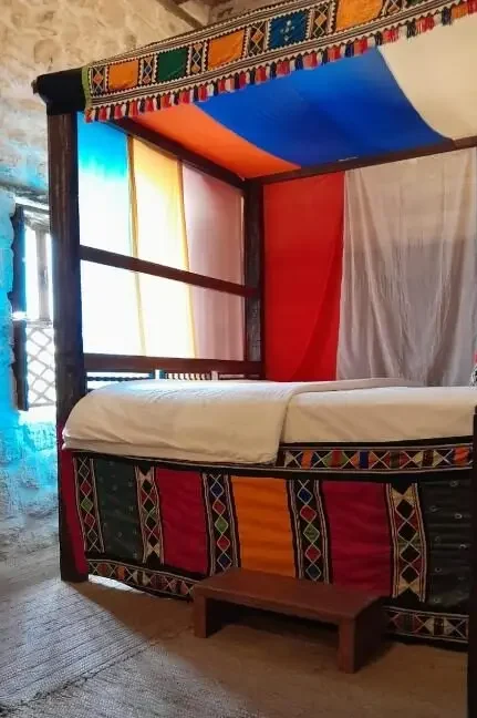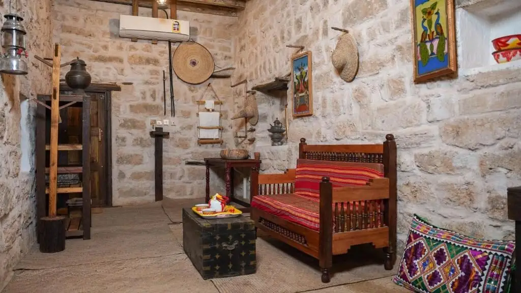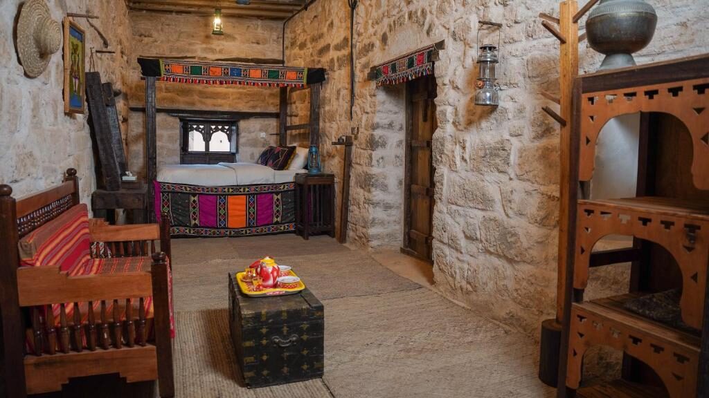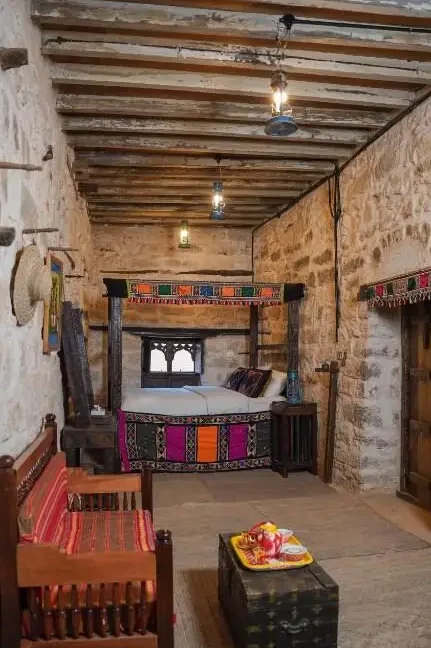 The Merchant Chamber (25 m²) reflects the history of Salem Koofan, the lodge’s former owner and a generous trader. In his era, Koofan became a hub for merchants and guests. This deluxe queen heritage room, designed in traditional Qaser style, features a queen-size bed, private bathroom, and handcrafted wooden seating. An extra bed is available. The ideal choice for guests seeking space, authenticity, and a cultural hotel experience in Oman.