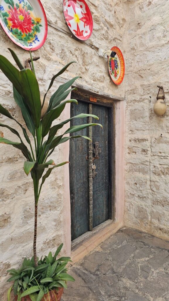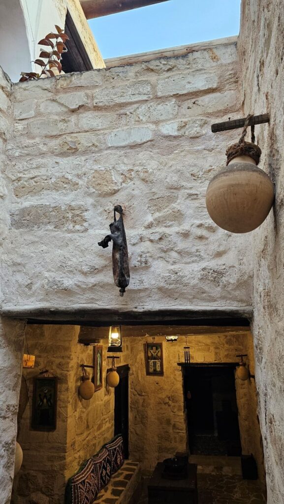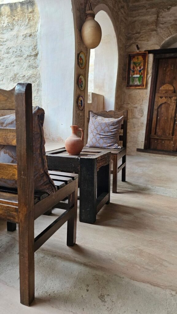 Its thick load-bearing walls are constructed from local “Quss” stone, bonded with a traditional clay mixture known as Yuba’a – a blend of earth, small stones and agricultural fibres compacted by hand to ensure strength and durability. This breathable structure naturally regulates temperature, keeping interiors cool during summer and comfortably warm in winter.